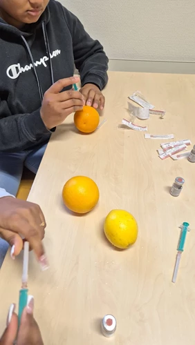 En wat was het interessant, leerzaam en bovenal ook leuk voor de leerlingen! In kleine groepjes werden door de leerlingen 5 ‘werelden’ uit de zorg bezocht. Zo waren er twee verpleegsters uit het SKB Winterswijk die met de leerlingen aan de slag zijn gegaan met bloeddruk meten en hoe injecteer je een vloeistof.