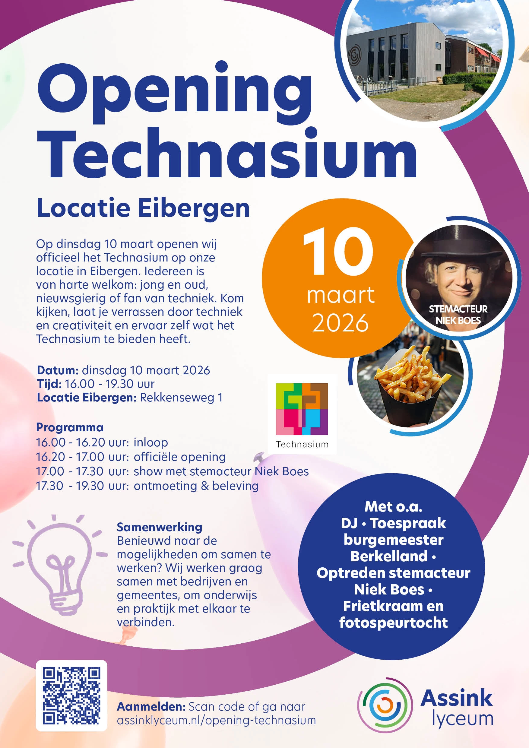 Op dinsdag 10 maart openen wij officieel het Technasium op onze locatie in Eibergen. Iedereen is van harte welkom: jong en oud, nieuwsgierig of fan van techniek. Kom kijken, laat je verrassen door techniek en creativiteit en ervaar zelf wat het Technasium te bieden heeft. Aansluitend is er ruimte voor ontmoeting en beleving.